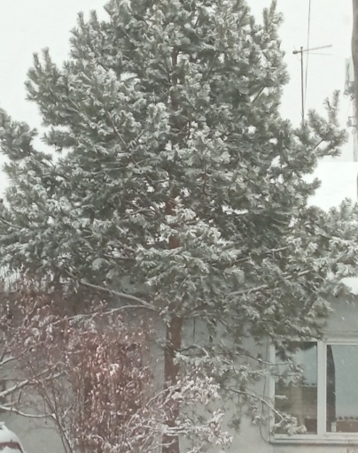 Снегом запорошило всё кругом. Вот такая красавица-ель под окном у соседей