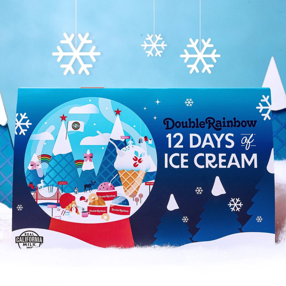 Подарочными наборами чая, кофе, конфет, шоколада и печенья давно никого не удивишь. А что вы скажете о гифт боксе брендового мороженого? Праздничную новинку представляет компания Double Rainbow Ice Cream. Мороженое в подарочной упаковке – чудесный сладкий адвент на рождественские каникулы. Хотите открыть его до праздников? Нет проблем! Ни дня без мороженого до Нового года – как вам идея? В праздничной подарочной коробке с обратным отсчетом представлено 12 сортов мороженого. Холодные десерты сделаны из натуральных, органических калифорнийских молочных продуктов. Компания Double Rainbow Ice Cream подчеркивает свою приверженность региональному партнерству, закупая ингредиенты на фермах в Калифорнии и сохраняя фермерский подход. Такую политику производитель мороженого ведет с момента своего основания в Сан-Франциско в 1976 году. Праздничный гиф бокс представлен в эксклюзивной упаковке. Вниманию потребителя предлагается коробка с изображением снежного шара. За каждой дверцей скрывается мале