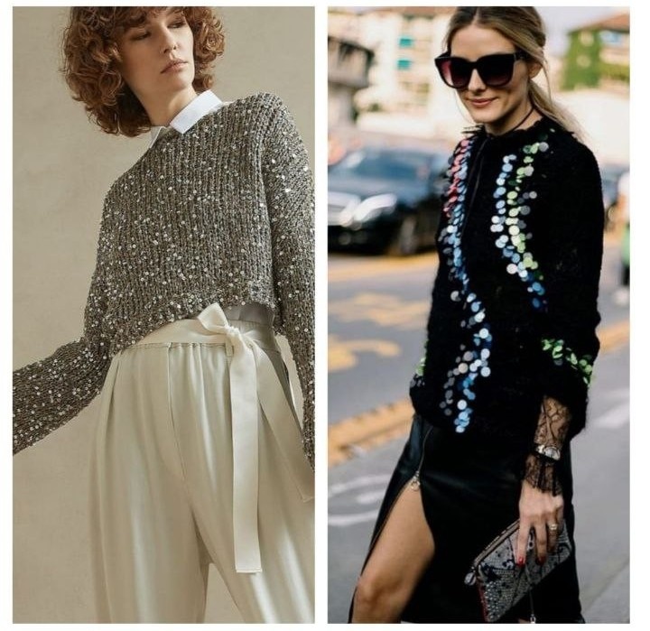 Главная стилистическая задача при создании повседневного образа с нарядными вещами - снизить градус праздника. Сделать это можно с помощью нейтральных простых вещей. Свитер или топ в пайетках должен солировать в образе, а фоновые вещи должны быть максимально базовыми.
