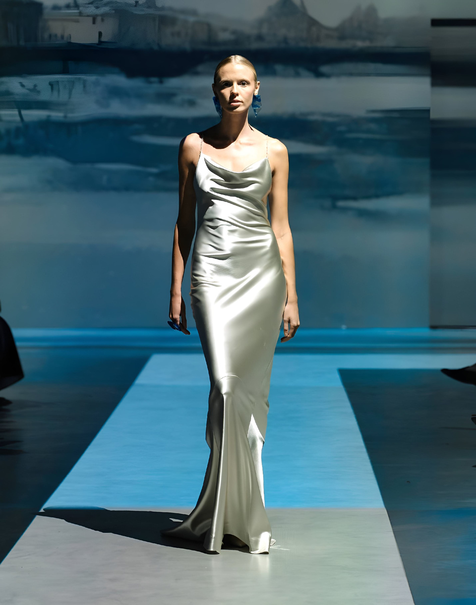 Сегодня платья-комбинации не воспринимаются как нечто оригинальное и дефицитное. Их уже можно отнести к классике. На показе Haute Couture 2025 было представлено длинное атласное платье в сдержанном, но весьма притягательном исполнении. Оно на тонких бретельках, с открытой спиной.