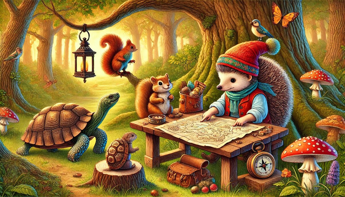 Ёшка сидел за своим маленьким столиком под дубом и внимательно смотрел на карту. За окном шелестели листья, а в дверь постучалась Белка. Она появилась с привычной энергией и любопытством. — Привет, Ёшка! Что это ты задумал? — спросила Белка, заглянув через его плечо. — Я собираюсь в путешествие, — ответил Ёшка, указывая на карту. — Но сначала нужно решить, что взять с собой в дорогу. — О, это важный вопрос! — воскликнула Белка. — Давай подумаем вместе. Например, еда. В дороге ты можешь проголодаться, и тогда твоя энергия быстро закончится. Но знаешь что? Чтобы я помогла тебе собрать орехи, тебе нужно показать свою ловкость. Как насчёт пробежать по моему маршруту среди веток? Кто быстрее доберётся до вершины дерева, тот и победил. Ёшка согласился, и начались соревнования. Несмотря на то, что Белка была быстрее, Ёшка проявил настойчивость и добрался до вершины. Это так впечатлило Белку, что она дала ему целый мешочек сушёных ягод и орехов. После этого Белка рассказала Ёшке, как лучше пла