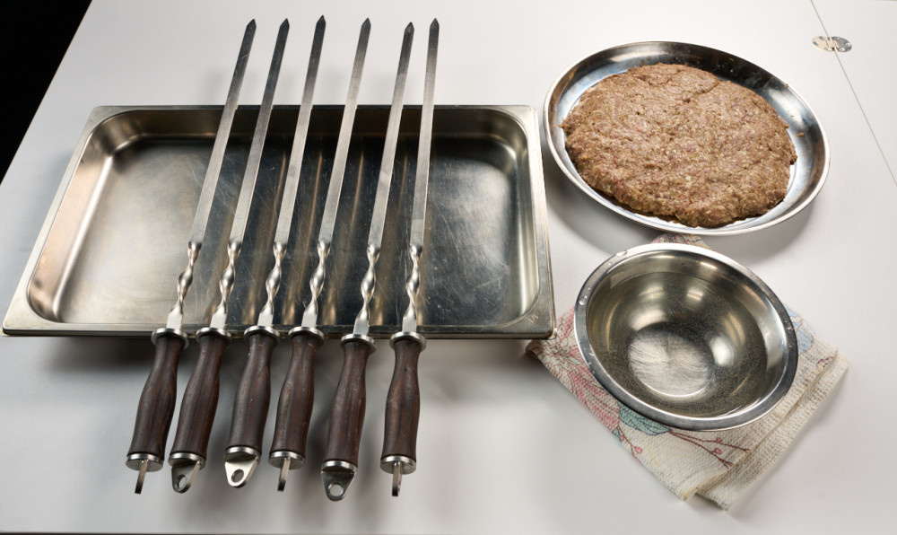Если нет гастроёмкости, положите на стол две деревянные рейки, например, 5 на 5 см. Кладите шампуры между ними! В Азербайджане поверх первого ряда укладывают второй ряд реек, на них ещё один "этаж" люля-кебаб, и получаются такие аппетитные этажерки, что... Впрочем, когда-нибудь сами увидите.