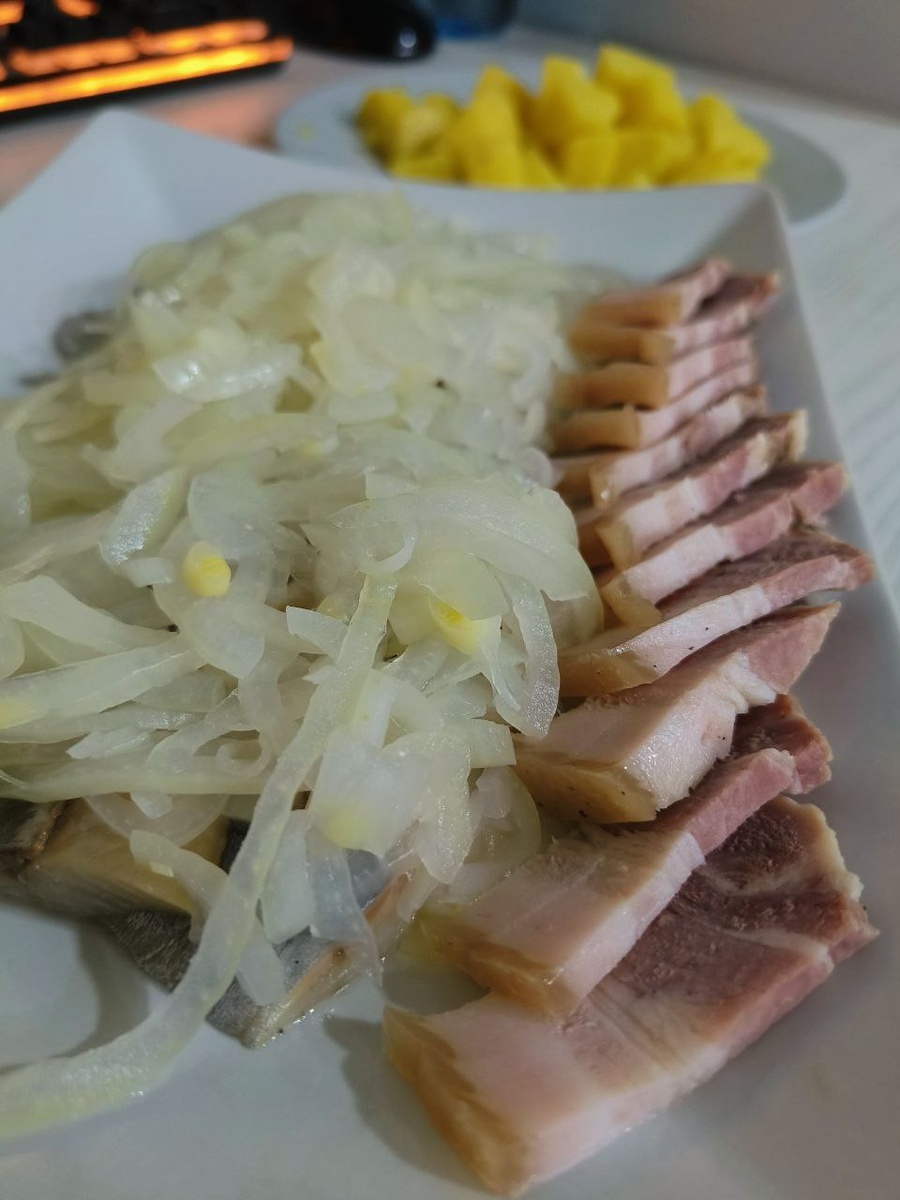 Друзья, всем привет! Сегодня захотелось поделиться простым как 3 рубля и в то же время очень вкусным рецептом закуски. Не знаю как у вас, а у меня глядя на фотографию - выделяется слюна) Итак, начнем с селедки. В наше время проще всего купить уже очищенную селедку, но не в обычном сетевом магазине, которая в масле лежит веками. Там практически ничего общего с рыбой нет. Я беру в пивном магазине рядом с домом. Уже разделанное филе сельди в масле. Экономит кучу времени и не нужно отмывать кухню от рыбы и костей. Просто нарезаем небольшими брусками. Луку хочется уделить отдельное внимание. Я готовил его по-разному и нашел идеальный рецепт ( на мой вкус). Режем лук на тонкие дольки, на столько, на сколько позволяет острота вашего ножа. На фото 2 средних луковицы. Пока режем - ставим кипятиться чайник. после этого пересыпаем порезанный лук в чашку, заливаем кипятком ( чтобы скрыло весь лук) и закрываем крышкой. Оставляем лук минут на 5-10. После выливаем воду из чашки и промываем лук под