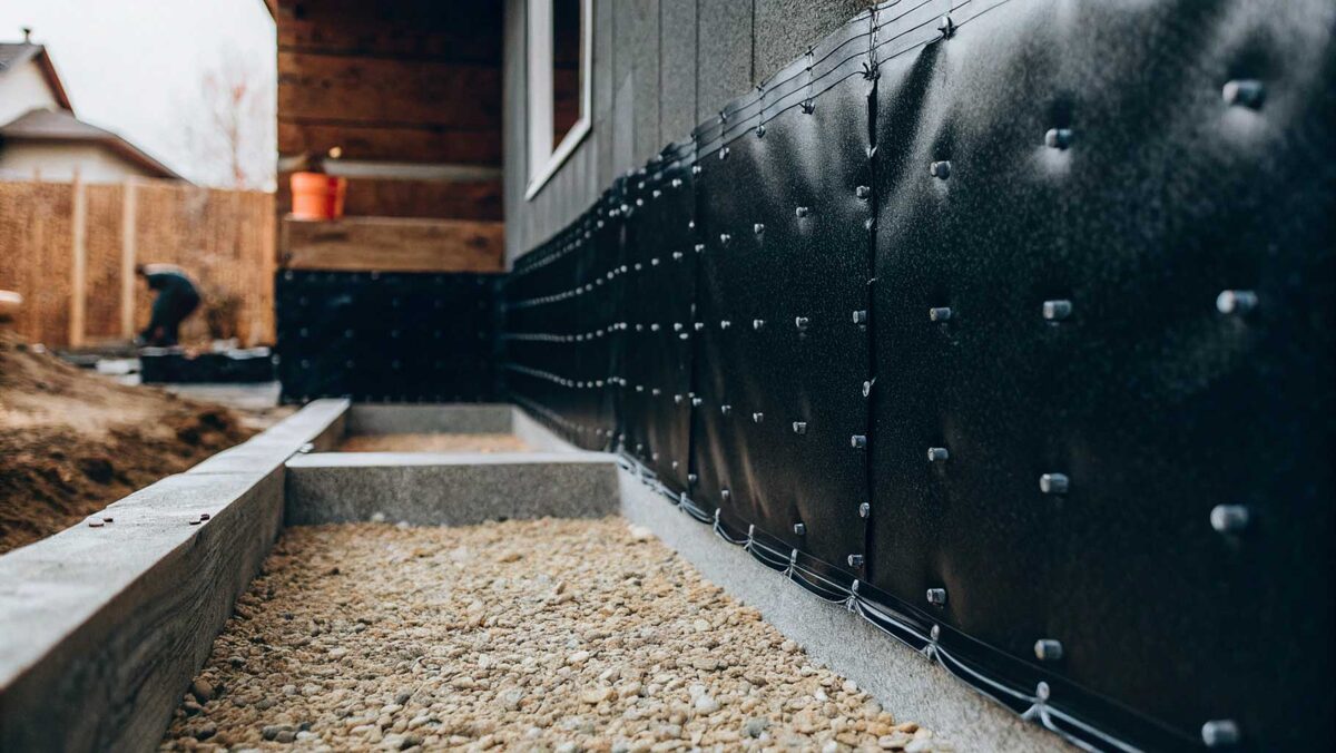 Установка защитной мембраны или профилированной мембраны для предотвращения механических повреждений гидроизоляции при обратной засыпке грунта.