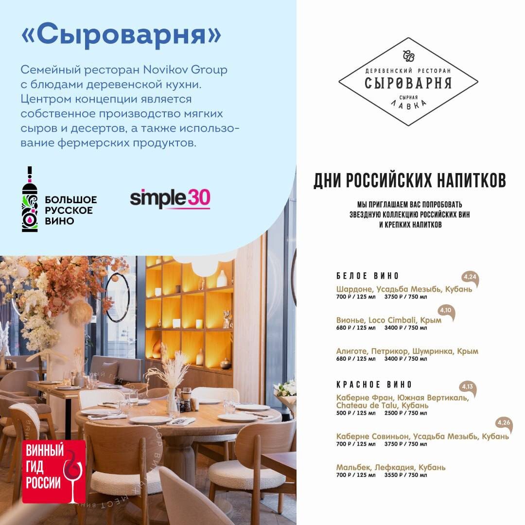 В сети ресторанов с ноября по апрель действует специальное предложение на вина с высоким рейтингом «Винного гида России» из коллекции «Большое русское вино» от Simple.