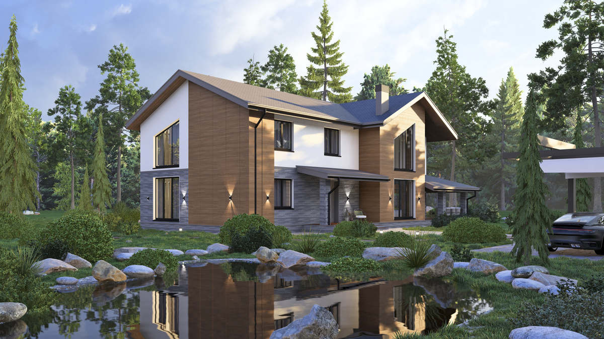 Среди обильной зелени и сосновых деревьев расположился большой коттедж в современном стиле. Сочетание кирпича и деревянных вставок на фасаде позволяет органично вписать дом в природную среду. Панорамные окна со скошенными углами не только дают большое количество света, но и становятся уникальным и необычным дополнением внешнего облика дома.