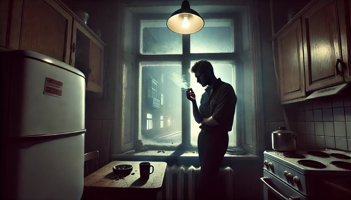 В темноте крошечной кухни, освещённой лишь тусклым светом лампочки, Михаил открыл пачку сигарет. Его пальцы уже привычно нащупали одну из них, словно этот ритуал был записан в его генах. Вздохнув, он зажёг спичку, наблюдая, как пламя охватывает кончик. Первый затяг всегда был самым долгожданным — резким, обжигающим и... таким «нужным». Он выдохнул облако дыма и посмотрел в окно. Там, в мёрзлом декабрьском воздухе, клубился туман. На улице спешили прохожие, закутанные в шарфы, а он стоял здесь — один на один со своей привычкой. «Ну что, Миха, мы опять?» — раздался из глубины живота странный, низкий голос. Михаил вздрогнул, оглядываясь. Никого. — Это я, твой желудок, — голос продолжал. — Мы давно не разговаривали, но мне надоело молчать. — Чего тебе? — буркнул Михаил, морщась. Наверное, это усталость, решил он. Или кофе с утра был слишком крепким. — Чего мне? — желудок фыркнул. — Ты каждый день засовываешь в себя эти ядовитые палочки и спрашиваешь, чего мне? Давай по-честному: скольк