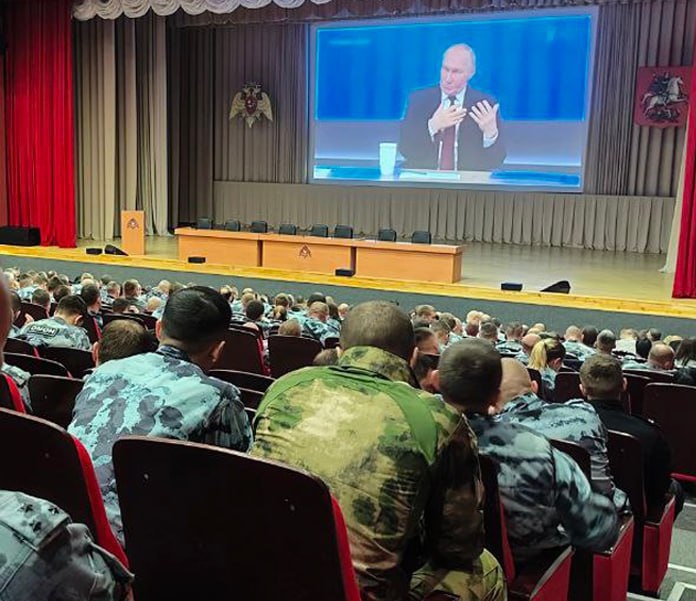 В зале общественно-спортивного комплекса Главного управления Росгвардии по городу Москве для личного состава организован просмотр прямой линии и большой пресс-конференции с Президентом России Владимиром Путиным.