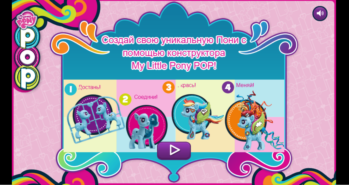 привет с вами милаша! в общем я лазила на сайте "игроутка" в поисках чего-то интересного и нашла игру "Конструктор Май Литл Пони POP". решила на неё сделать обзор. когда я зашла в игру она выдала такой экран: мне это сразу показалось интересным. но не буду спешить с выводами! сама игра может быть скучной. ладно продолжу. дальше я наконец нажала "начать". короче дальше последовало обучение в формате презинтации. оно было в нескольких слайдах которые я вам покажу тут: после просмотра этой презентации я нажала "начать" ещё раз. заиграла бодрая музыка. стала выбирать стороны и смотреть какие есть. оказалось там все главные герои но других нет. я выбрала что одна из сторон-флаттершай а другая-искорка. после этого нажала "продолжить". и тут вдруг заметила что игра отображает имя этой пони как "флаттерспаркл". ну и ладно. какая разница? получилась в итоге вот такая пони: итак нужно ещё фон персонажу подобрать. а тут самый итог: ну всё! как вам?