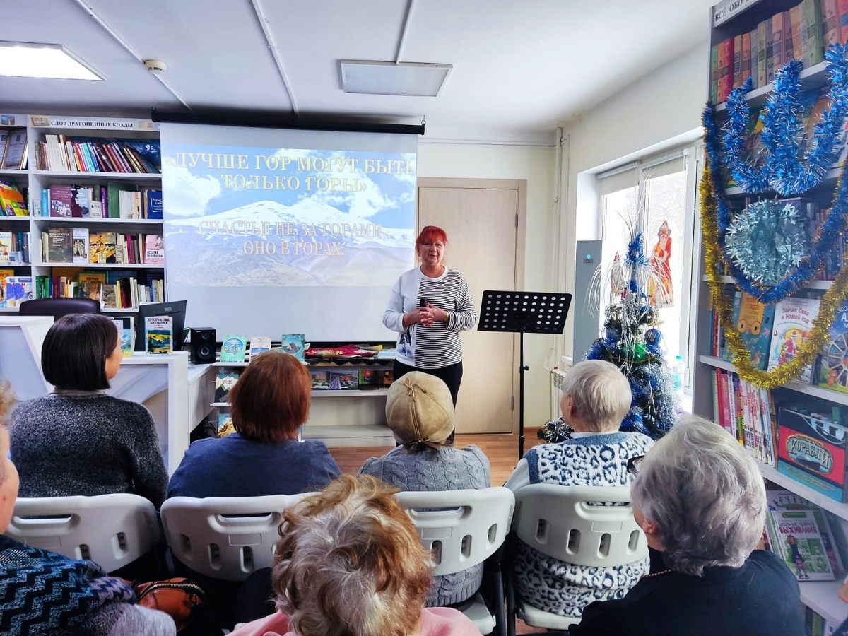 18 декабря в Библиотеку семейного чтения были приглашены люди старшего поколения на литературно-музыкальную встречу, посвященную Международному дню гор. Ведущая Анжелика Комарова рассказала о горных системах Земли и их вершинах, об известных альпинистах, об опасностях, которые могут подстерегать людей легкомысленных и самоуверенных.