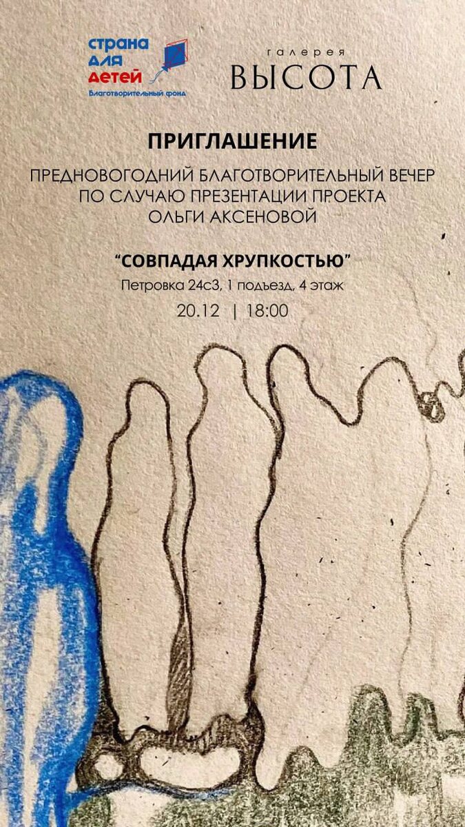 20 декабря приглашаем вас в Галерею ВЫСОТА на благотворительный вечер, организованный по случаю презентации работ художницы Ольги Аксеновой и лимитированной серии толстовок «Совпадая хрупкостью», созданной совместно с фондом «Страна для детей».