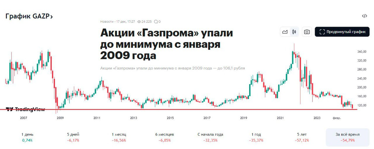 19 декабря цена акций Газпрома опустилась до уровня исторического дна, наблюдавшегося при их обвале в 2009 году. То есть, не просто на уровень 15-летней давности, а на минимальный краткосрочный уровень 15-летней давности. Цена приближалась к 105 рублям за долю в "национальном достоянии". На это обратили внимание даже федеральные СМИ. За поледние 15 лет Газпром дважды приближался к минимальным отметкам - в 2013 и 2017 годах, на этот раз акции опустились ниже обоих уровней. Исторический минимум был зафиксирован в сентябре 2009 года и составил 84 рубля за акцию. С начала текущего года цена упала на 33%, за последний год - на 35%, за последние 5 лет - на 57%. Все ниже, и ниже, и ниже... Я, наверное, один из тех немногих авторов и инвесторов, которые негативно относились к Газпрому всегда, даже когда он был на пике популярности и платил огромные дивиденды (в 2021-2022 годах). Ругал его на чем свет стоит, всегда аргументируя свое мнение его излишней политизированностью, следованию интересам