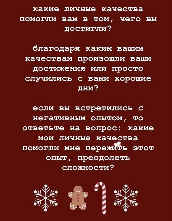 Здравствуйте, товарищи! Если вы ещё не заглядывали в свой телефон в поисках ностальгии по ушедшим денечкам, то сегодня самое время это сделать! Сегодня мы с вами займёмся формированием позитивного образа себя. Мы будем учиться видеть хорошее во всём, что нас окружает, и особенно в себе. Как же сделать наступающий год незабываемым, если не осознать, насколько мы замечательные? Да никак! Поэтому обязательно присвоим себе свои достижения, свои личностные качества, которые непременно найдем в поступках, которые вы совершили или в событиях, которые с вами произошли. Время выполнения: 15-20 минут Давайте вместе вспомним о прошедшем годе и о ваших достижениях. Откройте, например, фотографии и пролистайте их по месяцам: январь, февраль, март, апрель, май, июнь, июль, август, сентябрь, октябрь, ноябрь, декабрь. Это поможет вам восстановить в памяти всё самое лучшее, что с вами произошло, и найти повод для гордости. А уж после этого можно переходить к выполнению самого упражнения. Соста