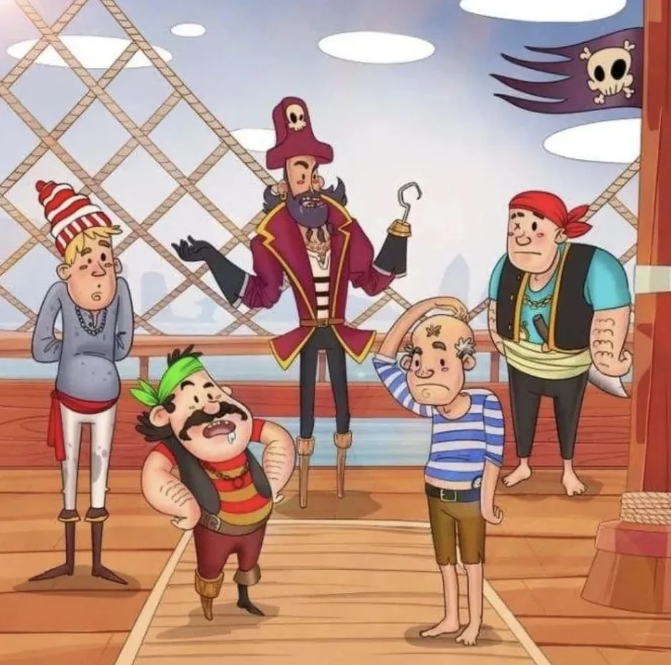 Испытайте себя на 100%! Однообразие в работе может негативно сказываться на продуктивности и эмоциональном состоянии, именно поэтому периодически стоит отвлекаться от рутины и разминаться. Предлагаем сделать это прямо сейчас! Итак, перед вами картинка, на которой изображена команда пиратов на палубе корабля. Они в панике, потому что потеряли компас. Он точно есть на этой картинке. Поможете морским разбойникам найти его? Когда у вас будет готов ответ, спускайтесь вниз и сравнивайте его с правильным. Он будет прямо за этой картинкой! Компас спрятан у одного пирата за поясом!
