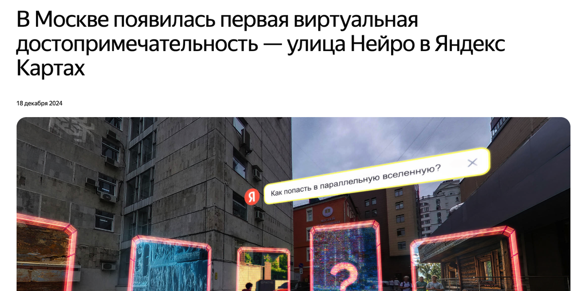 Россия делает шаг в будущее, открывая новую страницу в истории городских пространств. Улица Нейро, первая виртуальная достопримечательность нашей необъятной страны, созданная усилиями Яндекс Карт и топовых digital-художников которые очень старались для вас, приглашает пользователей в уникальную метавселенную или что то на её подобии. Этот проект соединяет элементы киберпанка, искусства и интерактивного контента, превращая привычную прогулку в погружение в абсолютно другой и не изведанный тебе мир другой мир. Что такое улица Нейро? Это не просто карта или виртуальный тур — это метавселенная, оживлённая искусственным интеллектом и визуальным искусством. Улица Нейро предлагает: