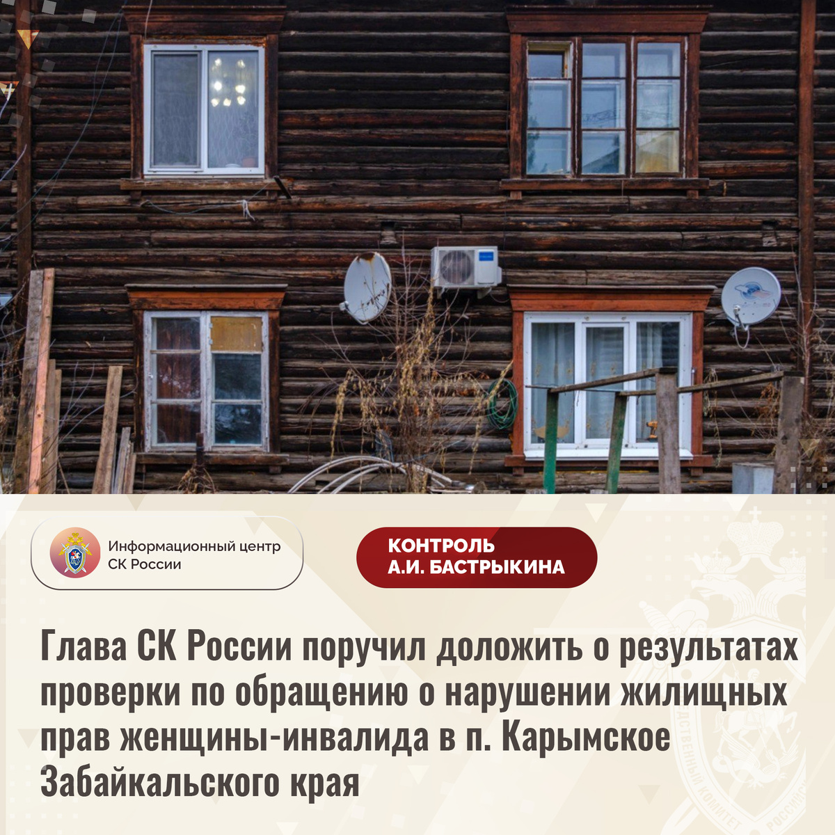 Глава СК России поручил доложить о результатах проверки по обращению о нарушении жилищных прав женщины-инвалида в п. Карымское Забайкальского края В приемную Председателя СК России А.И. Бастрыкина «ВКонтакте» поступило обращение о длительном непредоставлении жительнице поселка Карымское Забайкальского края, являющейся инвалидом, положенного жилья. Фасад и лестничные марши деревянного многоквартирного дома на улице Ленинградской, 1936 года постройки, в котором проживает женщина, длительное время разрушаются, централизованное отопление и санитарные узлы отсутствуют, температура в жилых помещениях не соответствует установленным нормативам. Несмотря на признание строения аварийным в 2016 году, а также вступившее в июле текущего года в законную силу решение суда о предоставлении жилья вне очереди, до настоящего времени ее права не реализованы, срок расселения установлен не ранее сентября 2025 года. Отмечается, что женщина перенесла семь операций на тазобедренном суставе, в связи с чем пере
