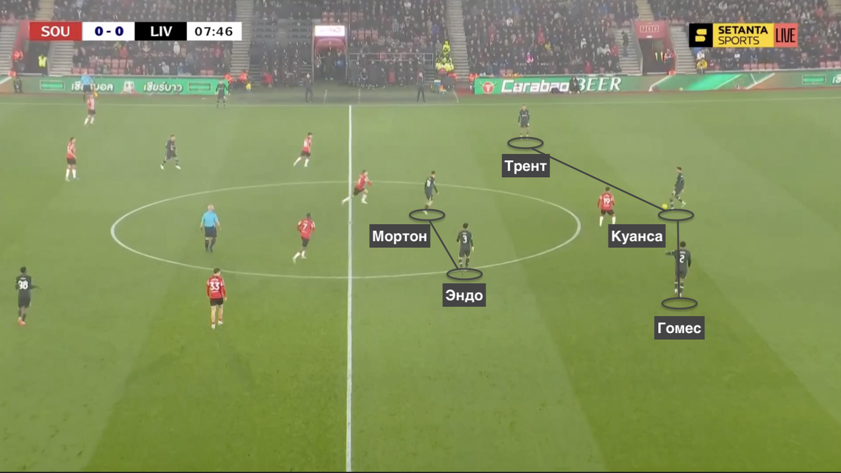 Отметим, что такая позиция Эндо не давало «Ливерпулю» численного преимущества в центре поля. «Саутгемптон» без мяча располагался в схеме 5-4-1, укрепляя фланги в линии обороны, а засчет пары опорных полузащитников, предположительно, намерен был усложнить «Ливерпулю» продвигать мяч через эту зону.