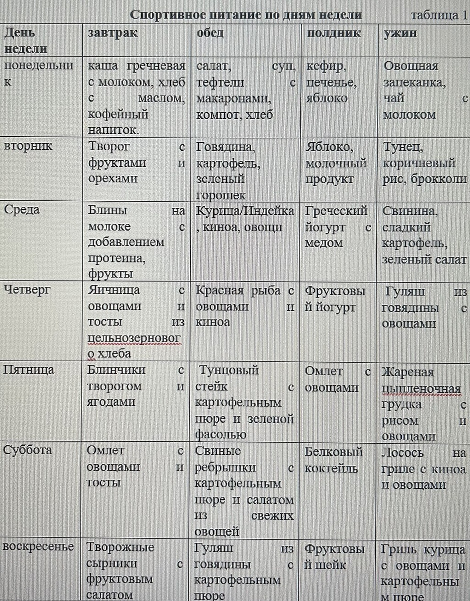 Недельная таблица питания