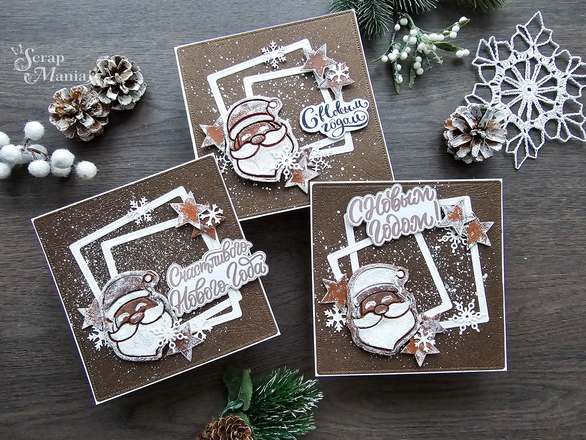 Добрый день, дорогие друзья! Сегодня я, Елена Верес, хочу поинтересоваться, а любите ли вы имбирные прянички? Их, правда, называют по-разному: кто-то - имбирными пряниками, кто-то - рождественским печеньем, у нас на севере в Архангельской области их зовут козулями, а в Скандинавии - пипаркукас. Традиция печь эти фигурные ароматные сладости со вкусом имбиря, жженого сахара, корицы и других пряностей, а потом украшать сахарной глазурью давно уже стала одной из любимых во многих семьях. Я же сегодня хочу угостить вас ... имбирными открытками! Да-да, именно так! Угощайтесь! А я пока расскажу вам рецепт. Итак, для приготовления имбирных открыток нам понадобятся: немного белой акварельной бамаги, текстурированный кардсток вкусного шоколадного оттенка, брызги белого акрила, фигурка Деда Мороза, "испеченная" из полимерной глины с помощью формочки для выпечки из Адвент-календаря ScrapMania, и самые главные ингредиенты - ножи ТМ ScrapMania: "Квадрат со строчкой. Округлые углы", "Звезды" и ножи