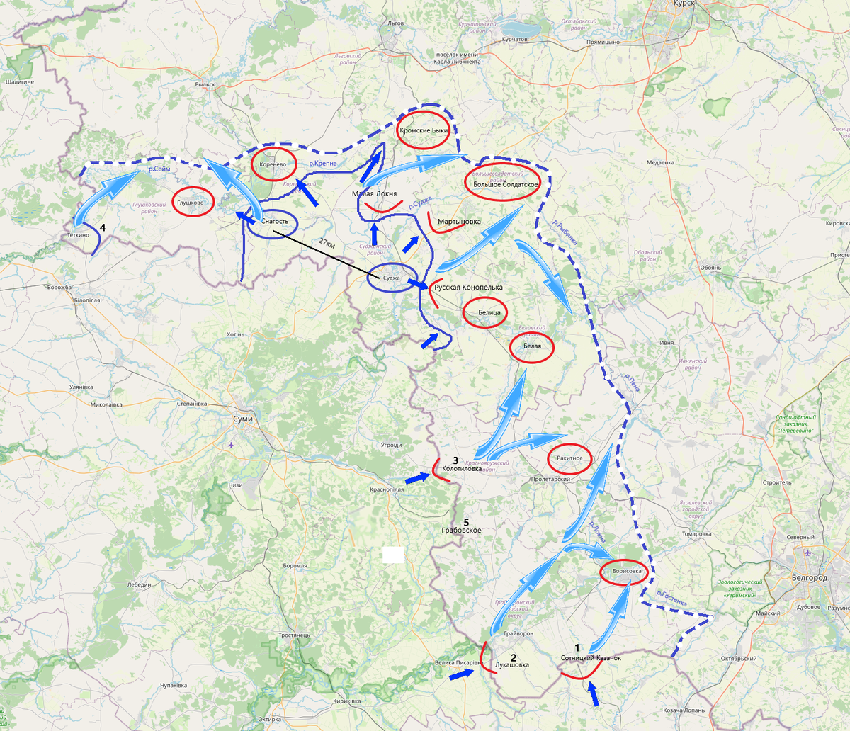 Курское приграничье. Итоги года Краткий обзор предыдущих месяцев 19 августа Зеленский заявил, что целью операции ВСУ в Курской области является «создание буферной зоны». Михаил Подоляк советник ОП обозначил целью операции ВСУ в Курской области усиление позиций на переговорах. Мне удалось взломать их почтовые ящики и вытащить секретную схему-))) Схема №1 Синий пунктир, это моя версия варианта минимальной буферной зоны. Опираясь на дугу из населенных пунктов (красные овалы) у противника открывается возможность и дальнейшего продвижения вглубь России. У него широкий выбор логистических путей - номера на схеме это планируемые противником доступные точки входа в "Буфер": Колотиловка,Теткино, Лукашовка и тд...И сразу нет необходимости, как сейчас протаскивать все через "бутылочное горлышко" одной "дороги смерти" Суджа-Юнаковка-Сумы и нести просто сумашедшие потери. Наверно многие помнят, как было уничтожено 15 бензовозов за раз. Схема №2 Схема сентября. Синие пунктирные овалы - это населенн