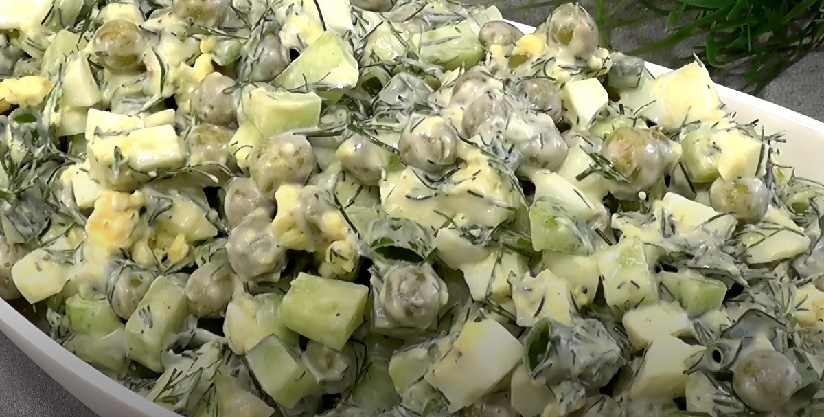 Зима — время, когда хочется чего-то легкого и свежего, чтобы разбавить насыщенные блюда праздничного стола. Этот салат «Зимняя свежесть» идеально подходит для этого! Он сочетает в себе хрустящие огурцы, нежные яйца и яркий зеленый горошек, создавая гармоничное блюдо, которое не только порадует глаз, но и удивит вкусом. Давайте приготовим этот салат вместе! 1-2 свежих огурца. 150 г консервированного зелёного горошка. 3 яйца. 2-3 ст. л. майонеза. Пара веточек зелёного лука. Укроп по вкусу. Смесь перцев. Соль по вкусу. Начните с варки яиц. Положите их в кастрюлю с холодной водой и доведите до кипения. Как только вода закипит, варите яйца на среднем огне 10 минут. В это время подготовьте остальные ингредиенты. Свежие огурцы нарежьте небольшими кубиками. Мелко нарежьте зеленый лук и укроп. После варки остудите яйца под холодной водой и очистите от скорлупы. Затем нарежьте на кубики. В большой салатник положите нарезанные яйца, огурцы, консервированный зелёный горошек, укроп и зелёный лук.
