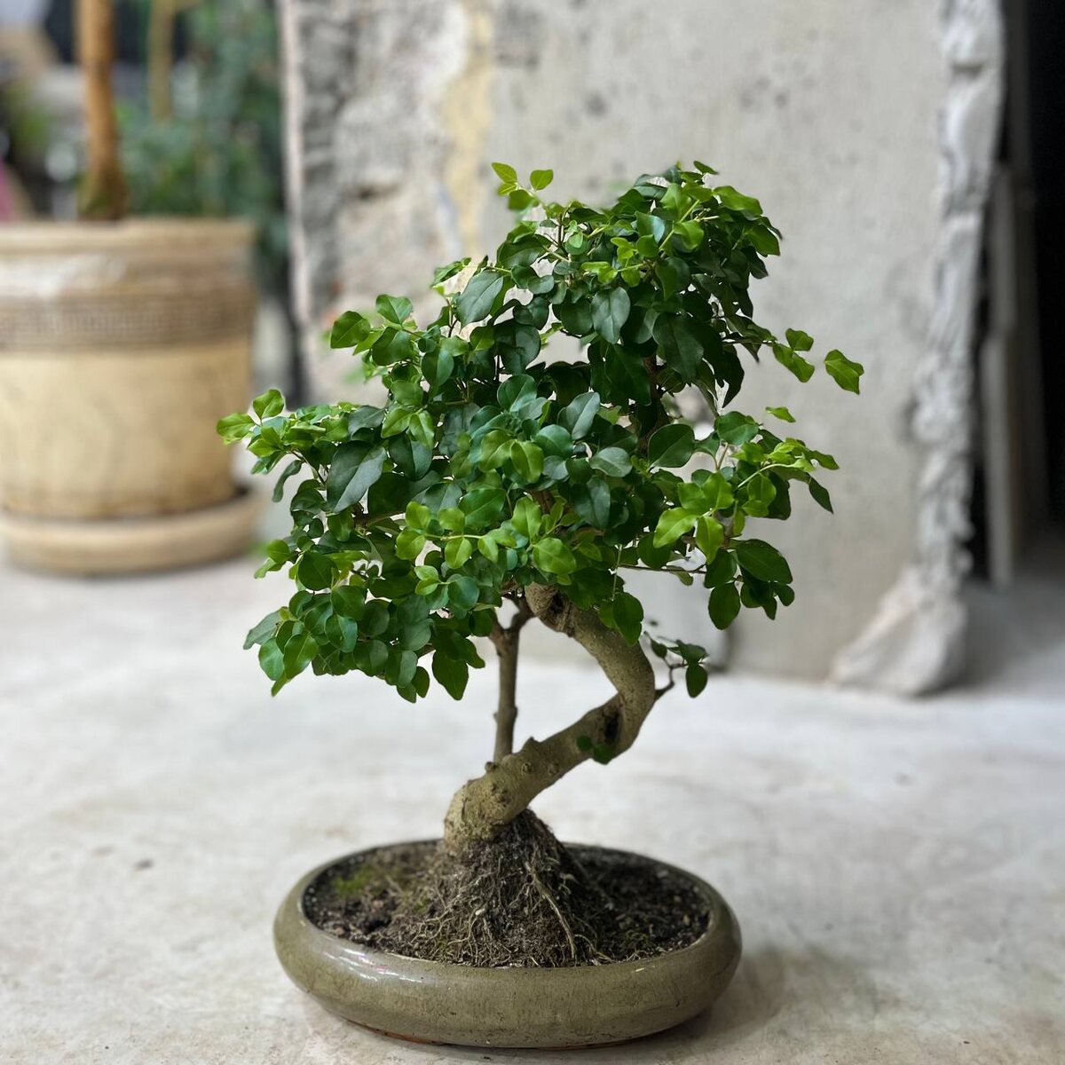 Бонсай Лигуструм (бирючина)- красивое дерево семейства Маслиновые. Естественным ареалом вида считается Юго-Восточная Азия. Лигуструм имеет необычную волнистую листву, она окрашена в темно-зеленый оттенок. Листва бирючины располагается на многочисленных ветвях, формирующих густую и раскидистую крону бонсай. При естественном выращивании дерево цветет. Этот процесс начинается летом и длится около трех месяцев. Во время цветения лигуструма появляются белые ароматные цветы, собранные в пышные соцветия. Дома бонсай не цветет.