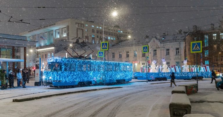 По маршруту А от «Чистых» запустили новогодний трамвай «Татра Т3» с прицепом со снеговиками