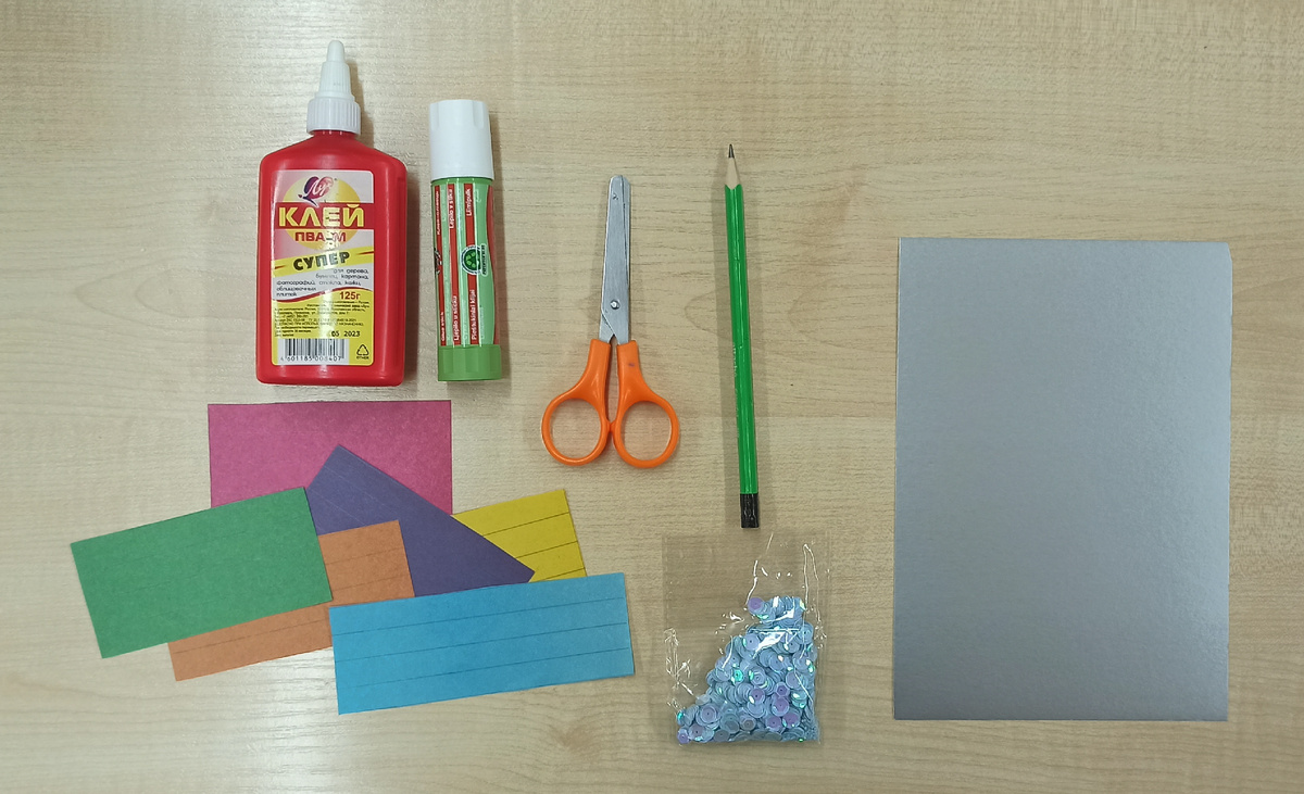 Мы завершаем предновогодние приготовления. И последнее, что нам осталось сделать - это новогодняя открытка. Украсим её нарядной ёлочкой из полосок цветной бумаги. Для её изготовления нам понадобится: - половина листа цветного картона формата А4 ( мы взяли серебряного и золотого цвета); - цветная бумага (небольшие квадраты или прямоугольники, 10-12 см) ; - карандаш; - линейка; - ножницы; - клей; - пайетки светлого оттенка (это будут снежинки). Этапы работы: 1. Цветную бумагу нужно разлиновать на полоски шириной 1 см ( в нашем случае я сама разлиновала, так как детям пока сложно это сделать самостоятельно) . 2. Режем бумагу на полоски. 3. Приклеиваем небольшой кусочек коричневой бумаги внизу листа посередине. Это будет ствол дерева (мы забыли это сделать, поэтому клеили уже в конце работы). 4. Начинаем наклеивать горизонтально по одной полоске, начиная снизу листа. Каждая следующая полоска должна быть немного короче предыдущей. Самую верхнюю полоску нужно наклеить вертикально. 5.