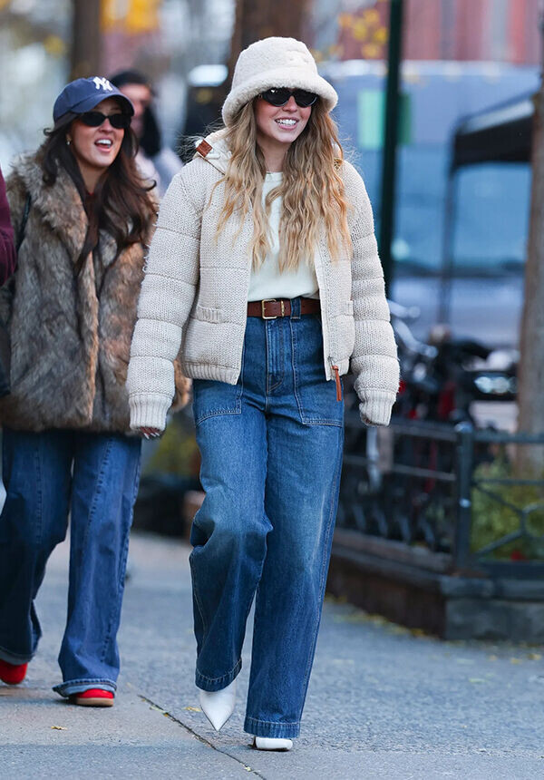 В зимние месяцы мода обычно отходит на второй план, уступая место практичным и теплым вещам. Когда небо серое, под ногами грязный снег, вариантов раскрасить свой день не так уж и много. Конечно, можно купить стильный пуховик, но самый простой способ дополнить зимний гардероб яркими деталями — меховая панамка. С 2021 года звезды не перестают носить этот головной убор. Рианна, Эмили Ратаковски, Белла и Джиджи Хадид, Дуа Липа и многие другие it-girls сделали яркие пушистые панамы частью своего зимнего стритстайла. Сидни Суини не осталась в стороне. Для декабрьской прогулки по Нью-Йорку актриса выбрала пушистую панамку из шерпы (искусственный мех, имитирующей шерсть ягненка) от Celine, украшенную эмблемой бренда Triomphe. К милому головному убору идеально подошел пуховик с вязкой под кардиган в белом цвете. Эффектные панамку и куртку Сидни Суини сбалансировала парой прямых джинс с широкими накладными карманами, подпоясанных табачно-коричневым кожаным ремнем Miu Miu, и свитером цвета слонов