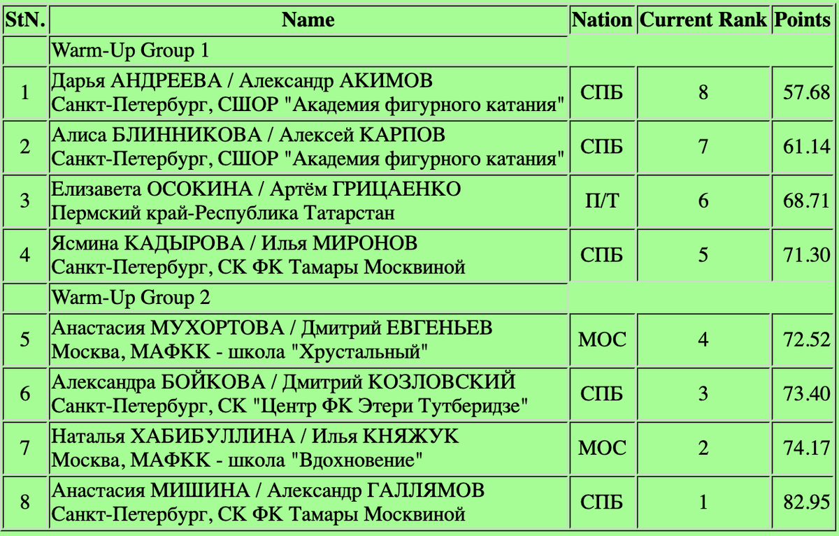 Баллы первого дня и порядок выхода спортсменов на лёд: