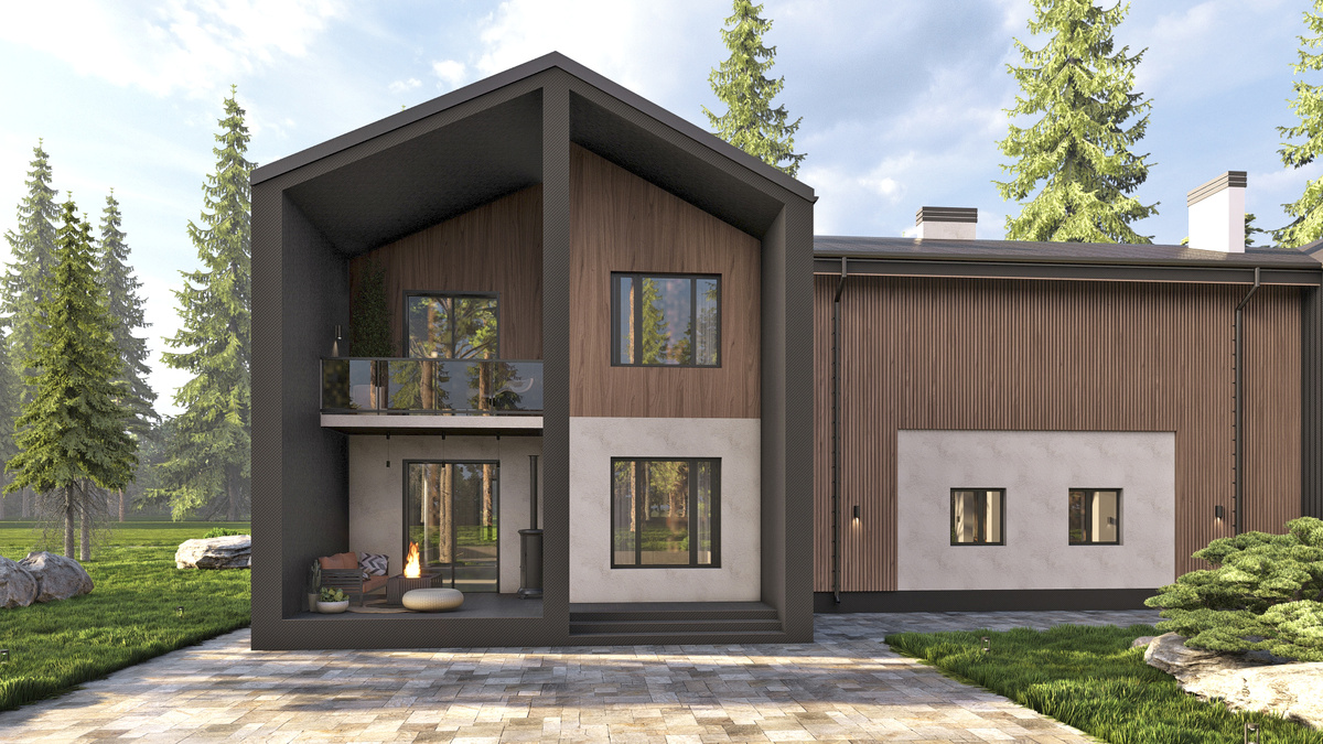 Данный проект представляет собой двухэтажный дуплекс в стиле барнхаус. Такое решение идеально подходит для проживания двух семей, поскольку позволяет всегда оставаться рядом с родными и близкими людьми. Общая архитектурная задумка сводится к минимализму, отказу от излишеств, стремлению к спокойствию и умиротворению.