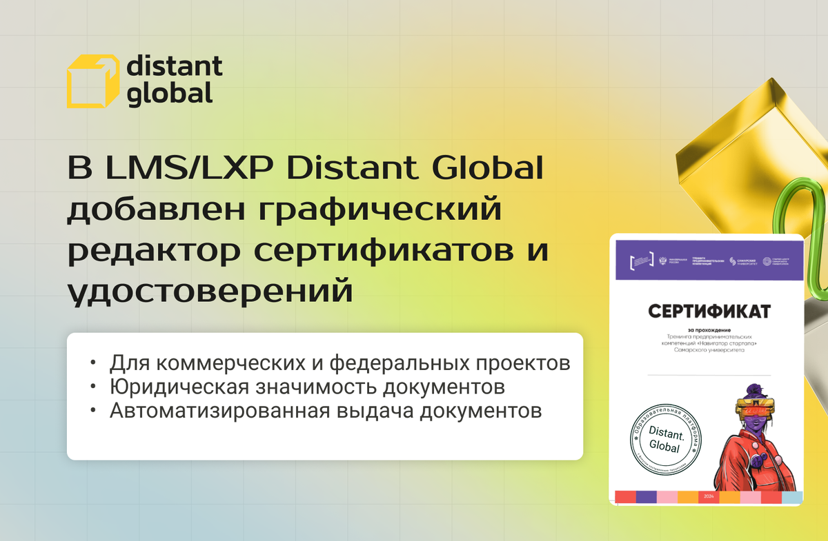 «Добавление графического редактора сертификатов в платформу Distant Global значительно упрощает процесс обучения, ведь теперь все процессы по созданию и выдаче удостоверений проходят на одной площадке. Это экономит время и деньги организаторов, вдобавок можно легко адаптировать внешний вид документов под уникальные требования образовательного проекта: добавить лого, фирменный шрифт и цвет на бланк. Возможность настраивать внешний вид сертификатов становится критически важной для успешного запуска проектов по федеральным и корпоративным программам, ведь для них характерно строгое соблюдение стандартов по оформлению официальных документов», — отмечает Наталья Абабий, управляющий партнер LMS/LXP Distant Global.
