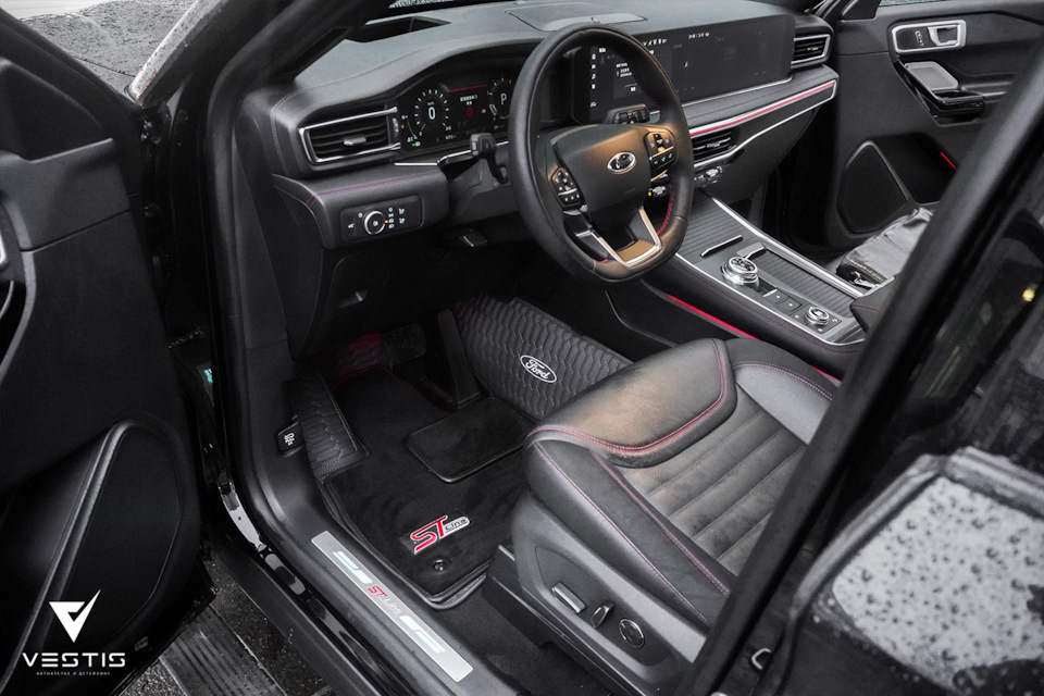 Комбинированный комплект из экокожи и ворса. Отшили и установили коврики для Ford Explorer. Комплект совмещает в себе два типа материалов и закрывает почти весь заводской ковролин. Верхняя часть изготовлена из плотного немецкого ковролина и крепится к нижнему на фиксаторах, что позволяет легко и удобно их снимать для мойки.