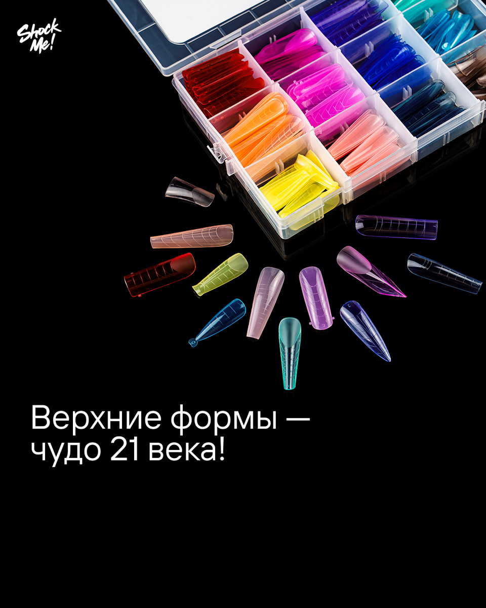Красить ногти стали еще в древнем Риме и Египте. Наращивание ногтей расцвело в 20 веке. А верхние формы перевернули этот мир совсем недавно. С верхними формами нарастить может даже новичок, но вот выполнить наращивание носибельных ногтей, с правильной архитектурой и закрытыми точками вроста, а уж тем более эксклюзивным дизайном или выкладным френчем это не простая задача. Но стоит отдать должное, что с верхними формами это в разы легче и быстрее чем работать на нижних формах. Верхние формы производит множество компаний. Они отличаются качеством пластика и размерным рядом, а так же видом самих форм ногтей. Каждый именитый мастер имеет свои курсы, где преподает свою технику работы с ними. И по факту когда новичок сталкивается со всем этим разнообразием его голова идет кругом. Какие формы купить, где учится и стоит ли учится вообще, какие материалы использовать? Компания Shock Me имеет самую широкую линейку верхних форм, с их помощью можно выполнить наращивание любой формы ногтей, н