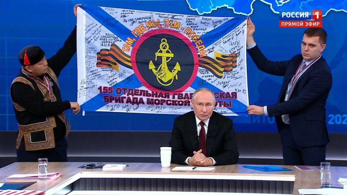 Копию знамени 155-й бригады морпехов передали президенту. Владимир Путин продемонстрировал его во время прямой линии, куда принес подарок.