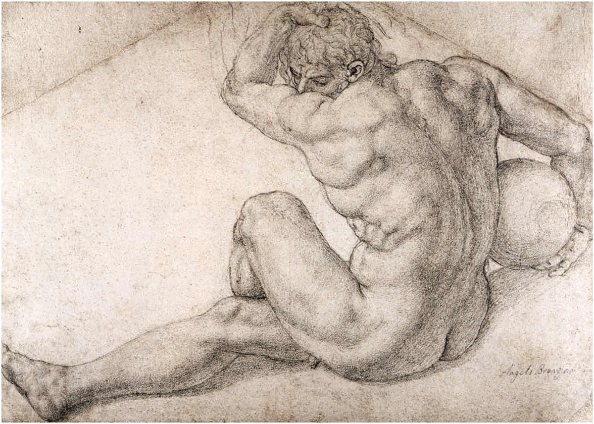 Аньоло Бронзино (1503-1572), итальянский художник-маньерист второго поколения, входит в число величайших рисовальщиков всех времен (хотя ему можно с уверенностью приписать не более сорока листов). Этот потрясающий тщательно выполненный этюд связан с одной из его наиболее исторически значимых картин «Мученичество Святого Лаврентия», созданной для церкви Сан-Лоренцо во Флоренции. Он послужил основой для сидящего речного бога в нижнем правом углу фрески. Герцог Козимо I Медичи заказал фреску в письме, написанном 2 февраля 1565 года непосредственно Бронзино (тогда это была особая честь для художника). Джорджо Вазари, ярый поклонник Бронзино, отметил фреску как "работу в процессе" в своих знаменитых «Жизнеописаниях» 1568 года. Окончательная работа была представлена 4 августа 1569 года. Сложная поза у показанной фигуры была создана для того, чтобы продемонстрировать мастерство Бронзино в технике рисования, анатомии и сложных эффектах перспективы (дань уважения Микеланджело, который уме