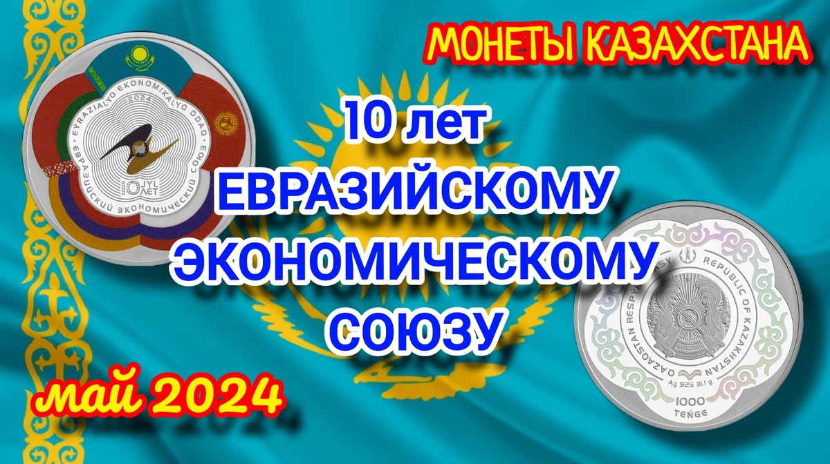 Вторая памятная монета, которую выпустил в обращение Национальный Банк Казахстана в 2024 году называется «WORLD PAINTING». Вышла она 29 марта 2024 года. Обзор этой красивой и необычной монеты есть на канале, поэтому ее пропускаем и движемся дальше. 6 мая 2024 года НБК выпустил в обращение коллекционную серебряную монету «ЕВРАЗИЙСКИЙ ЭКОНОМИЧЕСКИЙ СОЮЗ. 10 ЛЕТ» из серии «Выдающиеся события и люди». Данная монета отчеканена в соответствии с предложением Евразийской экономической комиссии о выпуске памятных монет в государствах-членах Евразийского экономического союза к 10-летию организации. Номинал: 1000 тенге Металл: серебро Проба металла: 925/1000 Масса: 31,1 гр. Диаметр: 38,61 мм Качество изготовления: пруф Технологии: интерференционное радужное изображение, цветная печать Тираж: 1000 шт. В центре лицевой стороны расположен Герб Республики Казахстан. Вокруг него написано название Банка на казахском и английском языках. Остальное поле заполнено национальным орнаментом. Вверху раз
