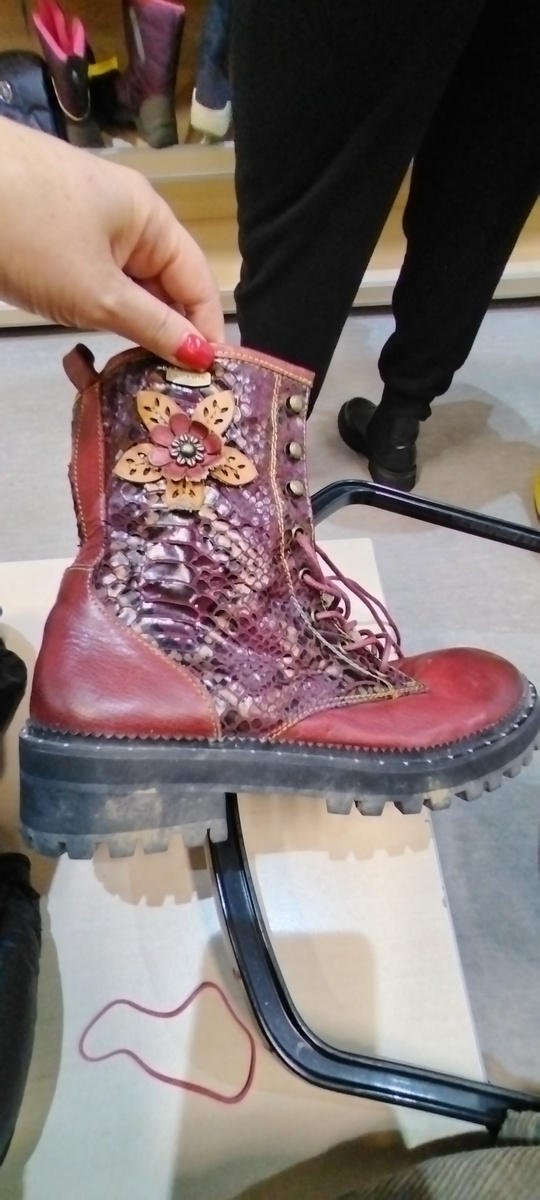 Здрасьте-здрасьте, мои дорогие читатели и смотрители! Сегодня сделаю небольшой обзорчик обуви, которую встретила на новом завозе и некоторую даже прикупила для моей любимой подписчицы " Стильный Скворечник". Настюшка, привет! И так, начнем! 1. Первыми мне приглянулись вот эти красные берцы из натуральной кожи. Их грубость сглаживает симпатичный цветочек сбоку, тоже из натуральной кожи. Правда боты оказались испачканы глиной, но это не умаляет их красоты. Laura Vita. У одного блогера смотрела, на этого бренда, ботинки, обзор. Французский бренд, красивой кожаной обуви, относительно молодой. Но не из дешевых. Примерно за такие ботиночки, на одном сайте, просят 21 тыщу рубликов. Так что есть свои плюсища в секонде))) Шикарнейшие ботинки, но велики. 38- й размер, 2000₽ Внутренний вид. Ботинки были куплены сразу, как только я их вернула на полку. 2. Кожаные, как я подразумеваю, зимние conversы. Практически в новом состоянии. Цена на них была смешной, каких-то 1200₽. Куплены для моей п