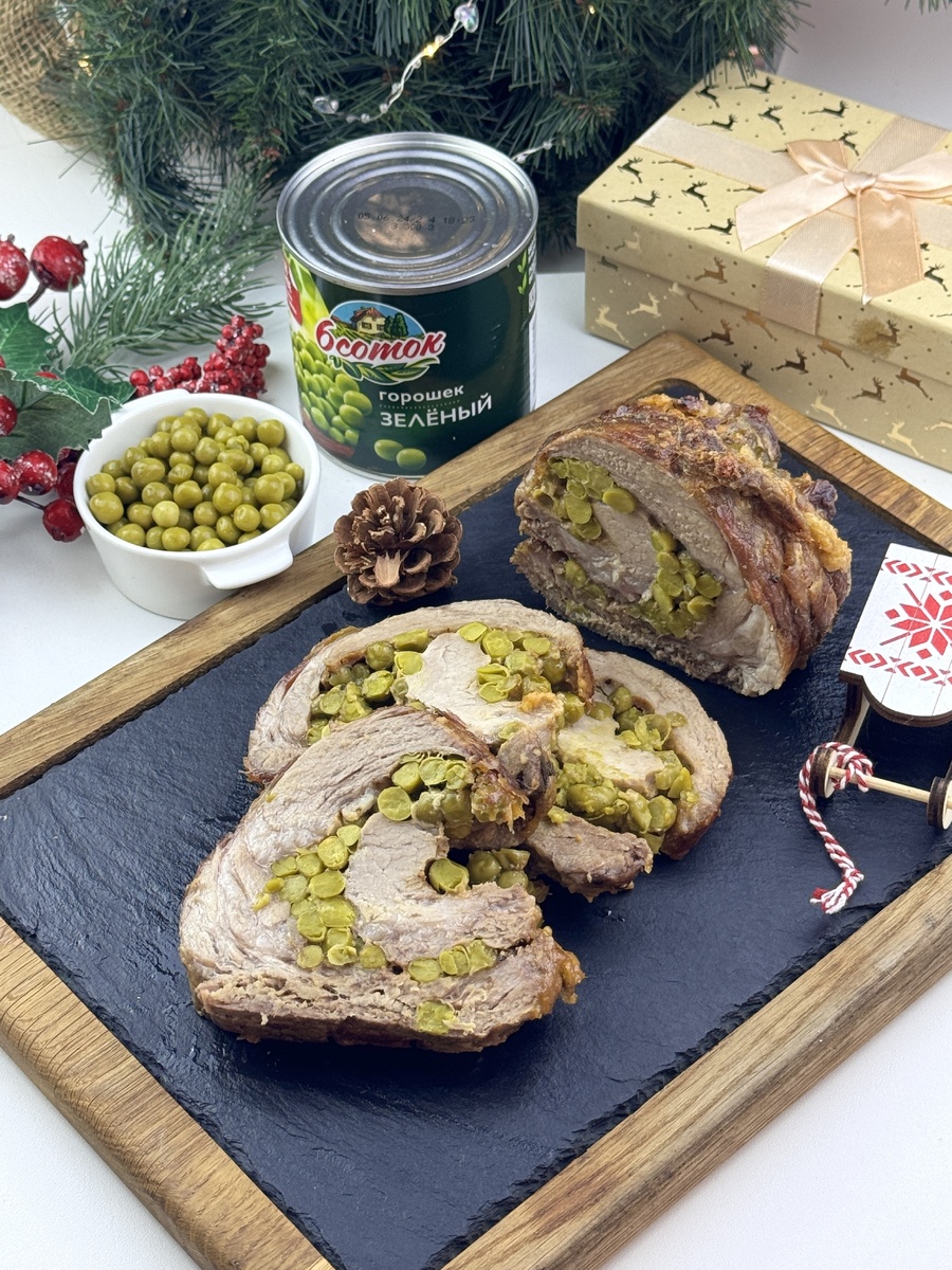 А что на горячее? Аппетитный свиной рулет, запеченный с зеленым горошком. Спорим, такой вы еще не пробовали? Наша находка для новогоднего ужина ;)