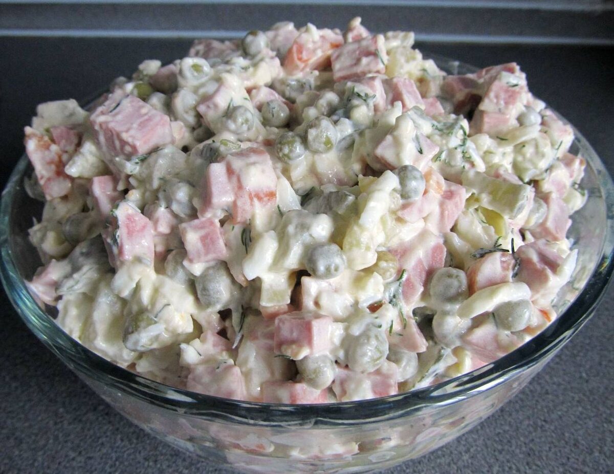 ВОТ ВСПОМНИЛА кстати, похожий салат, с таким же буквально составом как этот наш привычный оливье. Картошка, яйца, огурец свежий, морковь можно и лук. Только вместо мяса рыба отварная. Рыбный. Только заправляется маслом и гороха не надо. Тоже вкусно.( Блин), опять вспомнила что хочу его сделать.