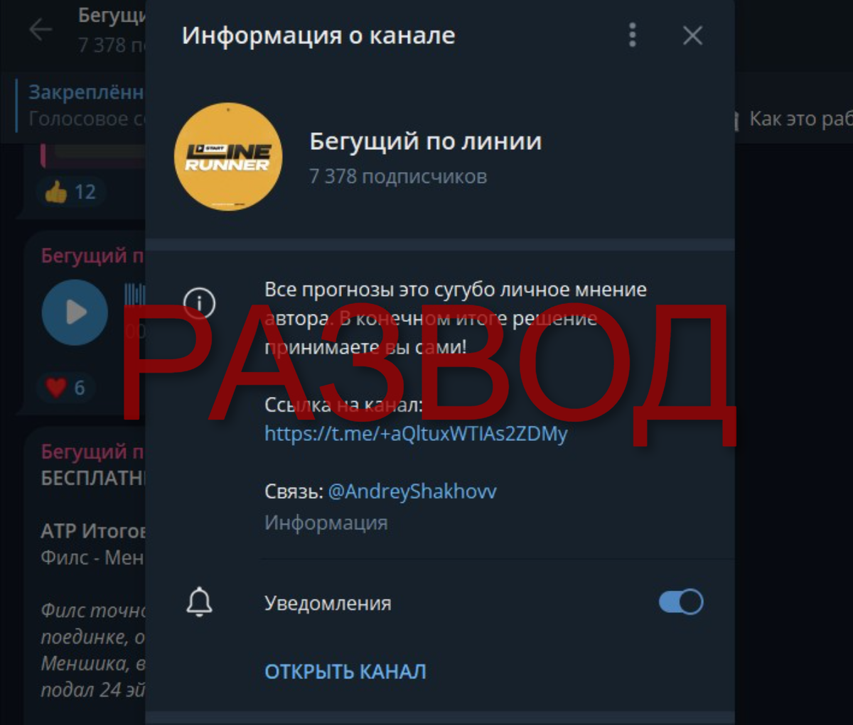 Telegram-канал "Бегущий по линии" активно рекламируется как надежный ресурс для ставок на спорт, где пользователи могут получить профессиональные прогнозы. Однако стоит ли доверять этому проекту? В этой статье мы тщательно разберем все аспекты его работы и представим правдивую информацию, чтобы вы могли сделать взвешенный вывод. Обещания и реальность Канал "Бегущий по линии" позиционируется как платформа, где опытный аналитик Андрей Шахов предоставляет прогнозы на спортивные события. В описании канала заявлены следующие преимущества: Однако наша проверка выявила многочисленные несоответствия между обещаниями и реальностью. Прежде всего, вызывают сомнения заявленные показатели проходимости ставок. Анализ бесплатных прогнозов показал, что их результативность далека от заявленных "высоких показателей". Кроме того, статистика платных ставок либо отсутствует, либо представлена исключительно выигрышными исходами, что создает ложное впечатление о работе аналитика. Скрытые нюансы работы Андре