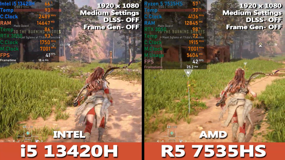 В одном из выпусков на YouTube-канале протестировали в Full HD лэптоп Acer Nitro с Ryzen 5 7535HS и с i5−13420H. Horizon Forbidden West шла с графикой Medium. В среднем в этой игре удалось получить 42 к/с (i5−13420H) и 43 к/с (R5 7535HS). GTA V запускалась на настройках графики Very High, с MSAA X2. Средняя производительность в ней равнялась 115 к/с (Intel) и 100 к/с (AMD). The Last of US I тестировалась с высоким пресетом. Средняя частота кадров здесь составляла 37 к/с (Intel) и 33 к/с (AMD). Counter Strike II шла с графикой Very High. Средний FPS в ней равнялся 107 к/с (Intel) и 101 к/с (AMD). В игре Hogwarts Legacy с пресетом High, DLSS Quality удалось в среднем получить 51 к/с (Intel) и 48 к/с (AMD). Игра Spiderman Miles Morales тестировалась на настройках графики Very High. Средняя производительность в ней составляла 53 к/с в обоих случаях. В Cyberpunk Phantom Liberty с ультра-пресетом средняя частота кадров равнялась 39 к/с (Intel) и 37 к/с (AMD). Warzone 3 шла с графикой Extreme