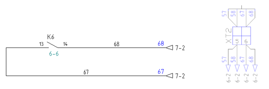 Проводники, соединенные стрелками с адресами источника и приемника с одинаковыми кодами, AutoCAD Electrical определяет, как единую цепь и присваивает один номер цепи. Свойства от источника цепи, такие, например, как тип провода, передаются приемнику.