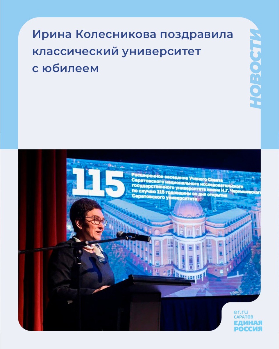 🎂Сегодня Саратовскому государственному университету имени Н.Г. Чернышевского исполнилось 115 лет. Заместитель Председателя областной Думы Ирина Колесникова приняла участие в мероприятии, посвященной этой праздничной дате, и наградила Благодарственными письмами преподавателей вуза. 💬«С гордостью считаю себя частью большой семьи нашего классического университета, потому что сама получила в стенах этого «альма матер» высшее образование по специальности «Географ, преподаватель географии». Глядя сегодня на ребят, ненароком задумаешься – что ждёт их впереди? Какой путь они выберут? Большая надежда и задача нас, как депутатов, заключается в том, чтобы этот путь был связан с Саратовской областью. Чтобы молодые специалисты не уезжали в поисках лучшей доли в столицу или другие регионы, а устраивали свою жизнь здесь, строили карьеру, создавали семьи. И обязательно приходили на новые и новые юбилеи нашего университета. 120-летие, 150-летие. Уверена, что СГУ без труда возьмёт и эти вершины, а
