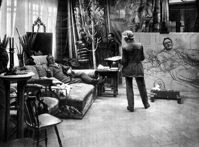 Шаляпин лежит со своей собакой Булькой на турецком диване у окна, а Репин стоит перед большим холстом, на котором мы уже видим рисунок фигуры, набросанный углем, и голову певца, по