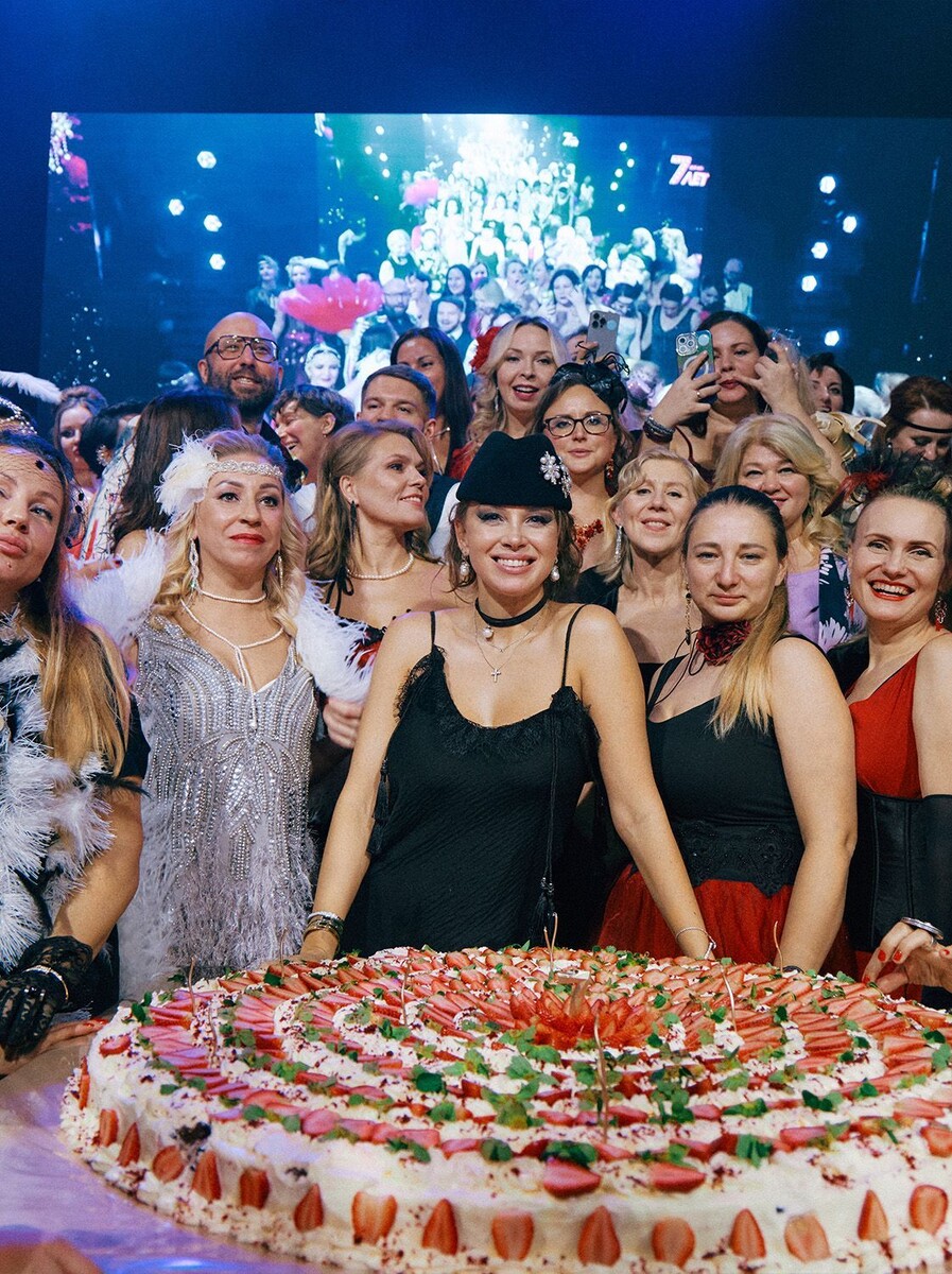 Под брызги фонтанов в финале вечера возник праздничный торт, размеры которого точно впечатляли не меньше, чем девушки-гимнастки под потолком.