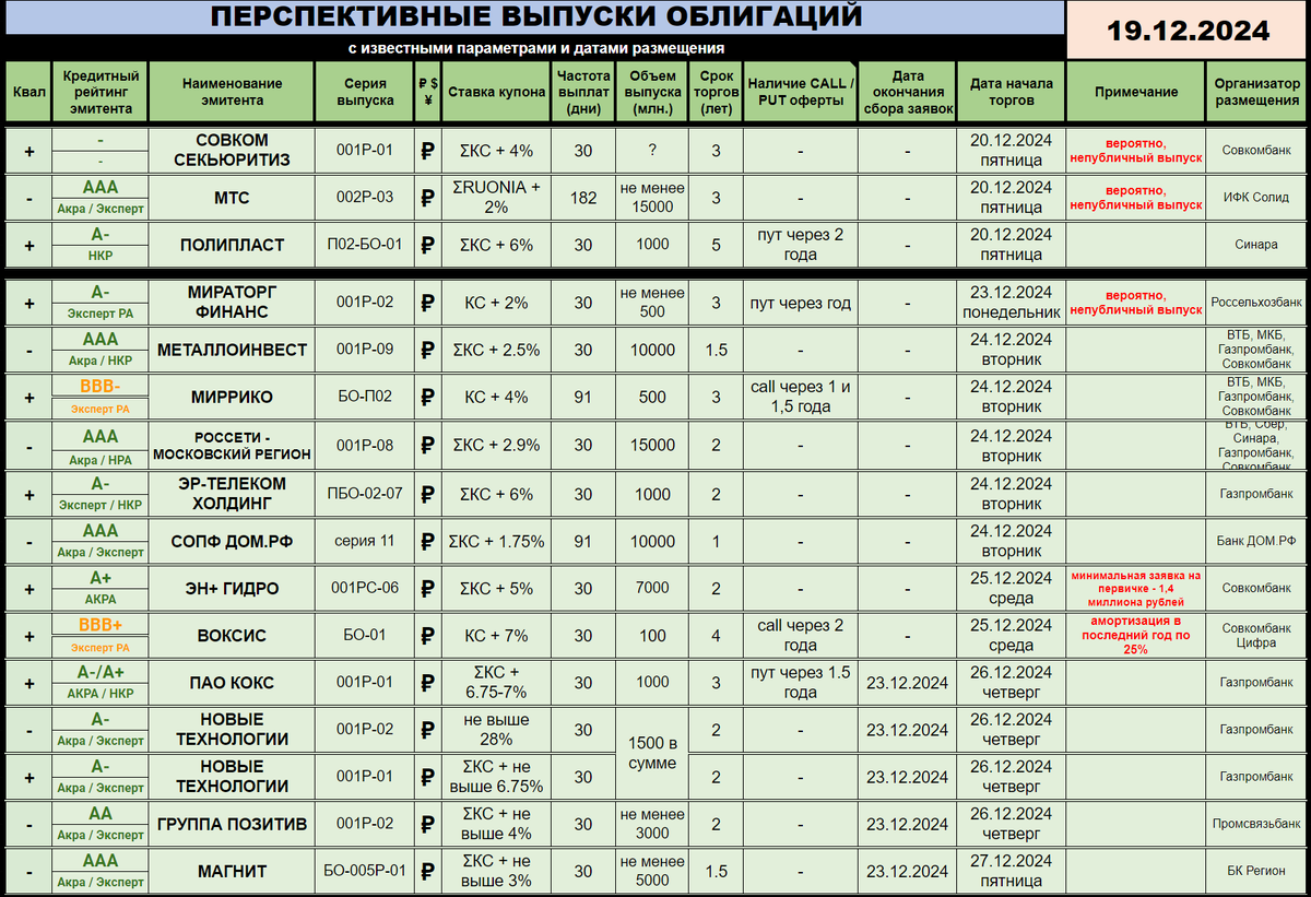 ✌️ Добрый вечер, дамы и господа! Капельку выбился из расписания, попытаюсь нагнать уходящий новостной поезд :) Анонсами сегодня вновь порадовали! ---------- 🆕 НОВЫЕ РАЗМЕЩЕНИЯ / АНОНСЫ: ❄️ Блудный КОКС (🅰️➖ / 🅰️➕) таки вернулся на биржу, поняв, что без него никуда! Кредитные рейтинги компании крайне разнообразны, но давайте все же верить более младшему. Итак, 1 миллиард рублей в рамках выпуска 001Р-01 на кону, трехлетний срок торгов, оферта через полтора года. Ежемесячный купон манит ориентиром ставки ΣКС + 6.75-7%, что вполне релевантно текущей обстановке. Сбор заявок пройдет 23 декабря, торги начнутся уже 26-го числа, в четверг. Бумага будет доступна лишь квалам. ❄️ ГРУППА ПОЗИТИВ (🅰️🅰️) также успевает в последний вагон. В рамках выпуска 001Р-02 компания предложит не менее 3 миллиардов рублей, которые получат двухлетнюю прописку на бирже. Доступ к выпуску будут иметь все инвесторы, которых вознаградят ежемесячным купоном, ориентир которого замер на прекрасном уровне ΣКС + н