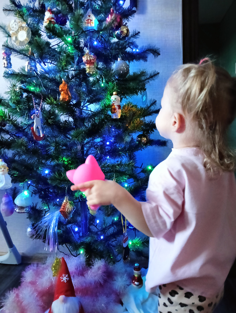 Виктория или не ставить ёлку если есть маленький ребенок? Вешать ли стеклянные игрушки? В прошлом году дочери на Новый год было всего 9 месяцев, она ещё не бегала и елку особо не трогала, только рассматривала. В этом же году Виктория совсем большая и шкодная. В первый день все игрушки доступные для Вики - были сняты и разбросаны по всей квартире. Первая мысль была - разобрать ёлку или снять все красивые стеклянные игрушки и повесить те, которые не жалко и не бьются. Планировала получить примерно такую ёлку: Но решила дать ещё один шанс себе, дочери и ёлке 😃. Последовали долгие разговоры о красоте, свойствах стеклянных игрушек и методах обращения с ёлкой. Да, я понимала что ребёнку ещё нет даже двух лет, но считаю, что ребёнок - это всё - таки маленький взрослый, поэтому разговаривать с ним надо, просто повторять и объяснять придётся намного -намного больше раз. А ребёнок у меня ооочень активный и шкодный. К вечеру первого дня разговоров ( и собственно второму дню стояния ёлки) при