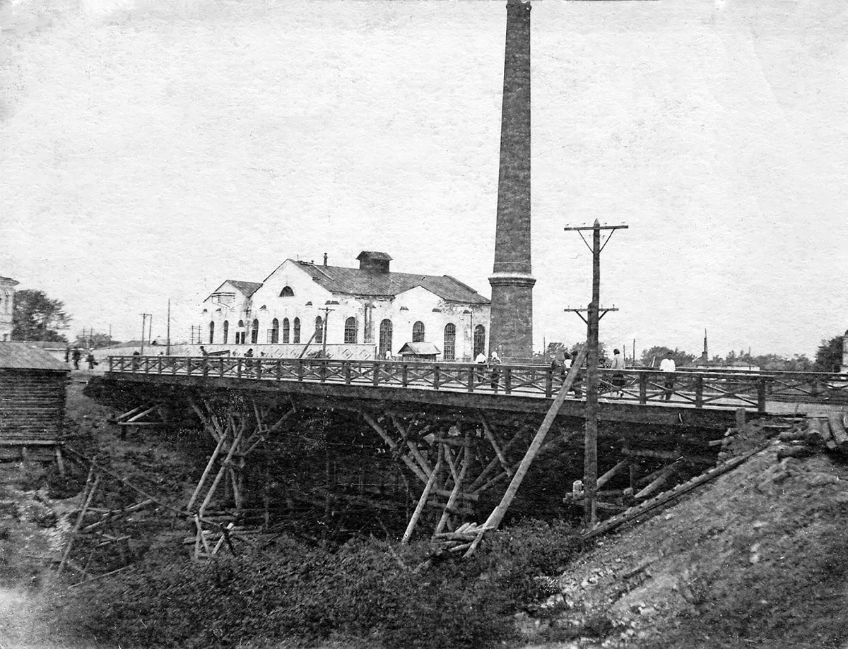 На снимке 1941 года мы видим выстроенный годом ранее автомобильно-пешеходный Рыбнорядский мост. Это была уже третья версия моста через Золотуху в этом месте, начиная с 1863 года. Финальную точку поставили к 1967 году, когда от моста отказались и сделали насыпь с железобетонной трубой. Нынче гости города даже не понимают, что пересекают речку, выезжая с улицы Лермонтова на Мира. Мне, как жителю города, обидно, что из здания «Труда» не сделали какое-нибудь интересное пространство, а просто подло снесли. На снимке же это ещё действующая электростанция, которая была построена к 1924 году и стала второй в городе. По началу её хотели назвать в честь Ленина, который в этом же году умер. Однако, позднее решили всё же увековечить имя председателя горсовета Вологды Николая Александровича Смирнова, при котором началось строительство. Так электростанция и вошла в историю, как электростанция им. Смирнова.