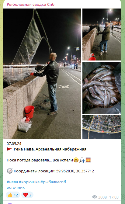 1) Река Нева, Арсенальная набережная. Одна из самых популярных и рыбных локаций на Неве в черте города. Лучше всего ловят с причала напротив улицы Михайлова. Там есть железный каркас из недостроя, но с берега на него не попасть, хоть и расстояние всего 10 метров от причала. Поэтому обычно рыбаки приносят с собой небольшую резиновую лодку и на ней доставляют друг друга туда-обратно. Глубина там хорошая и корюшка часто крупная попадается. А все остальные рыбаки ходят с пауками от этого причала до Литейного моста.